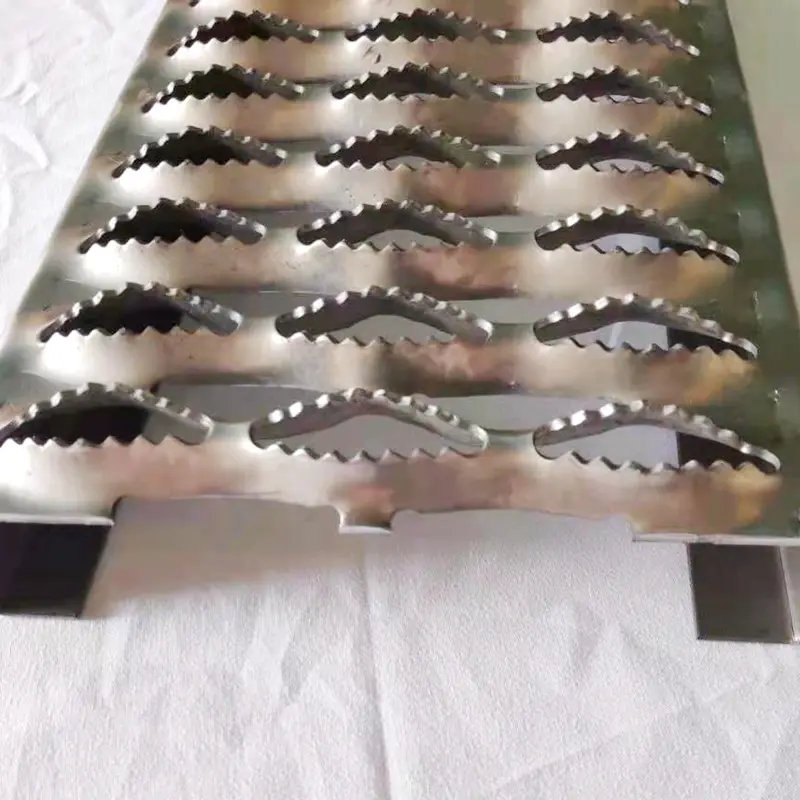 The metal anti-skid dimple channel grill has a serrated surface that provides adequate traction in all directions and positions.