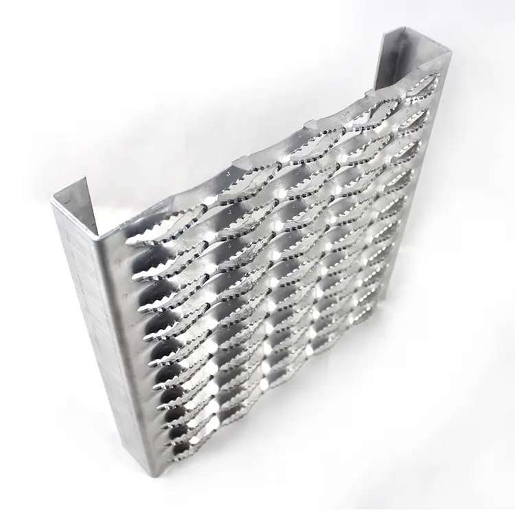 The metal anti-skid dimple channel grill has a serrated surface that provides adequate traction in all directions and positions.